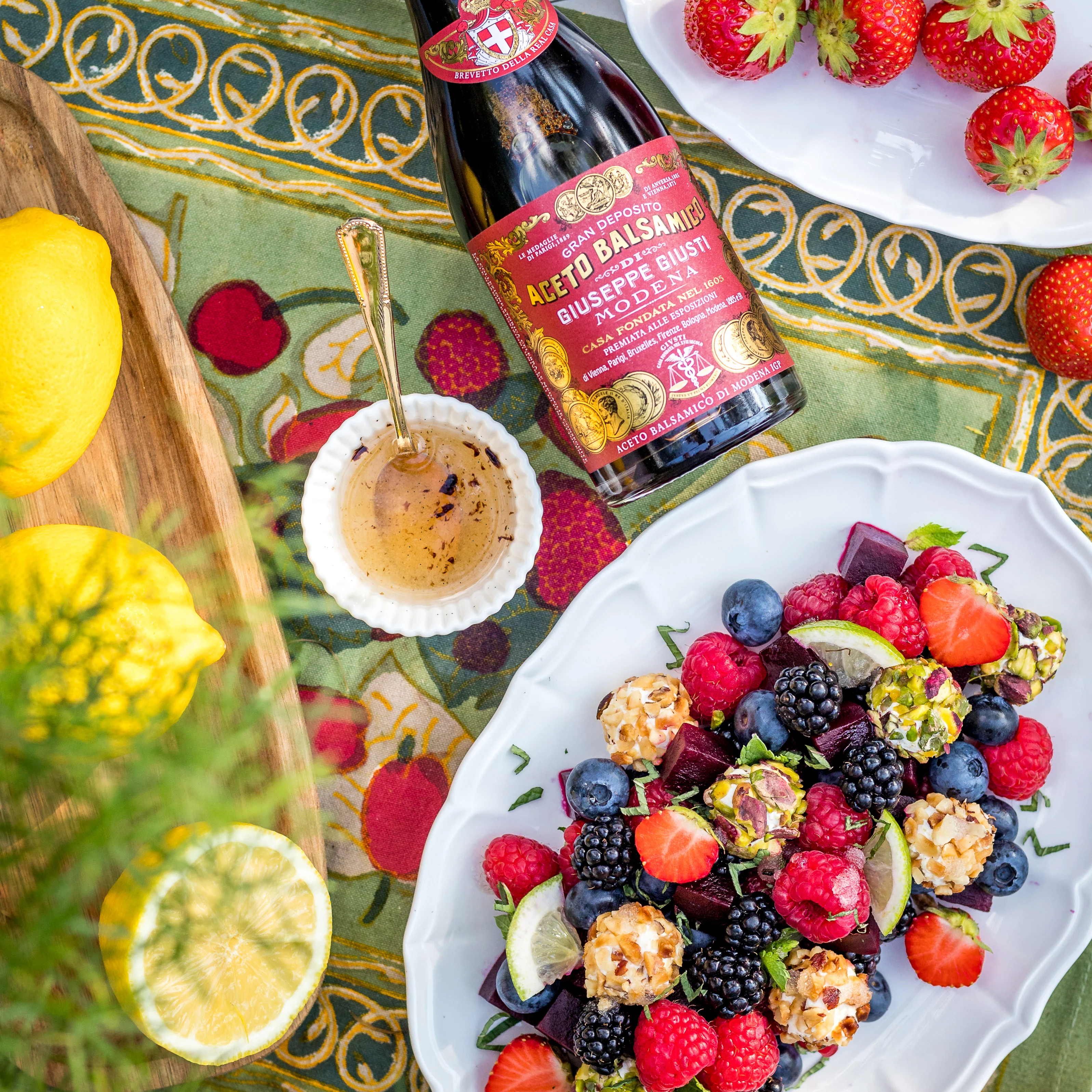 V tej sveži in barviti solati se prepletajo zemeljski okusi rdeče pese, sladkost rdečih sadežev in nežna kremnost sirnih kroglic. Ključno vlogo pri povezovanju vseh sestavin pa ima kakovosten balzamični kis Gouseppe Giusti, ki jedi doda prijetno kislino in rahlo sladkasto aromo.